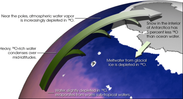 How O18 and O16 are distributed throughout the oceans. Credit: earthobservatory.nasa.gov